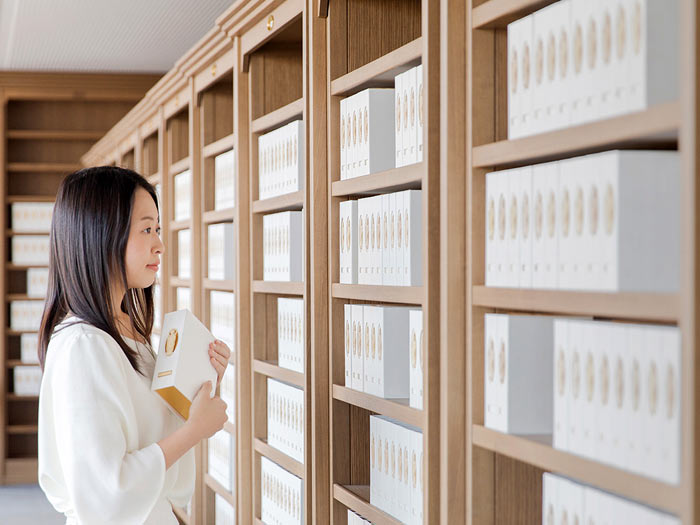 書架式というどこにもないお墓のスタイル。ひかりの魂手筺(たまてばこ)と呼ばれる納骨箱を使用し、ご遺骨を一体ずつメモリアルブックとして収蔵いたします。