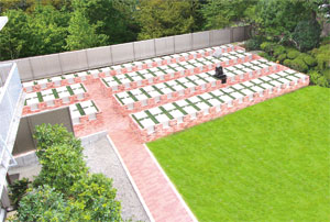 赤レンガの段を設け、常緑の玉リュウを敷き詰めたテラスは、目に鮮やかでお参りしやすい墓所です。